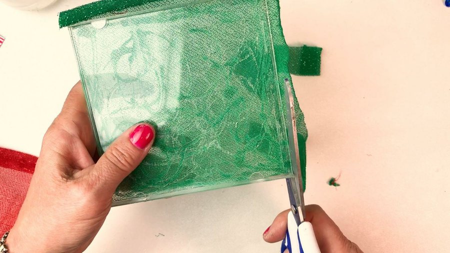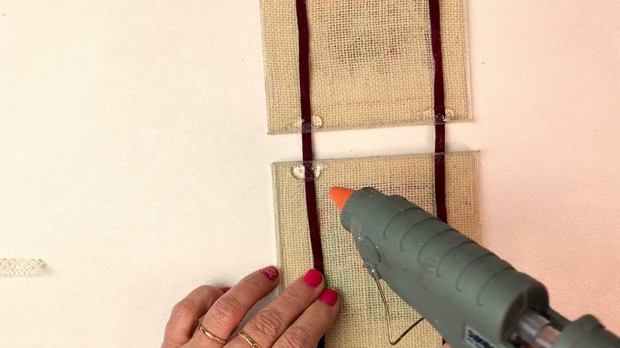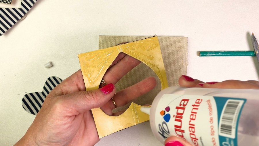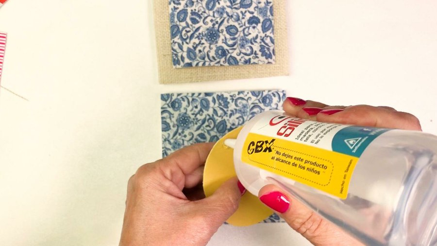 Para este tipo de tela mejor pegarla con pegamento de silicona, me aseguro aplicarla muy bien sobre los bordes para que no se deshilache y luego en el centro. Apoyo la tela y presiono y la dejo secar.