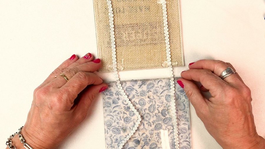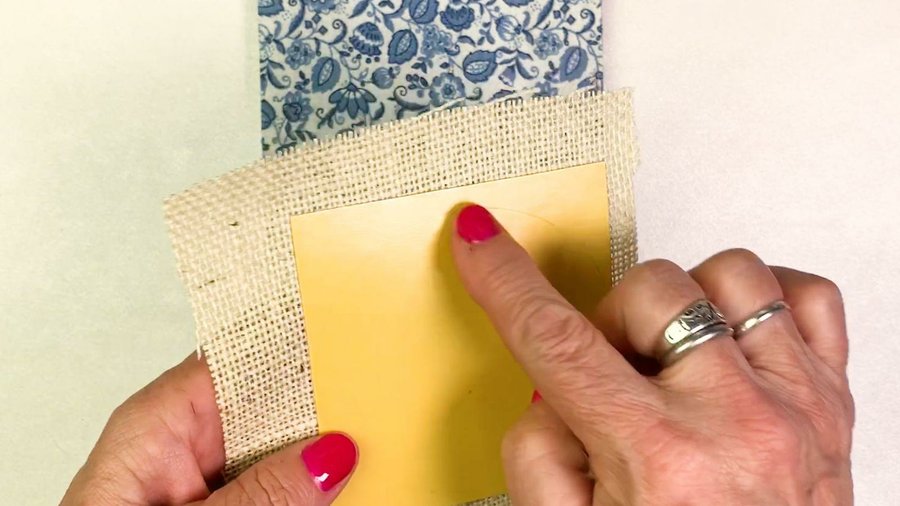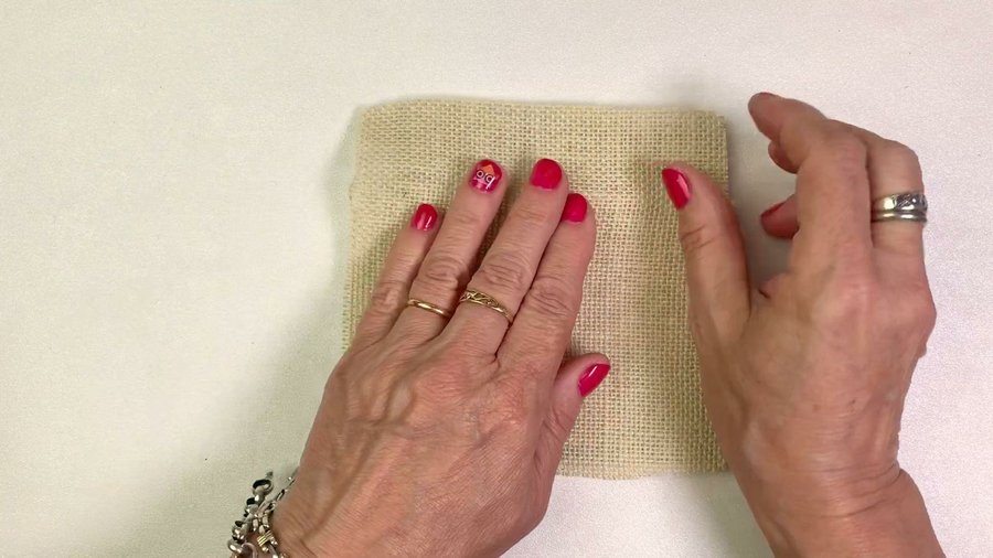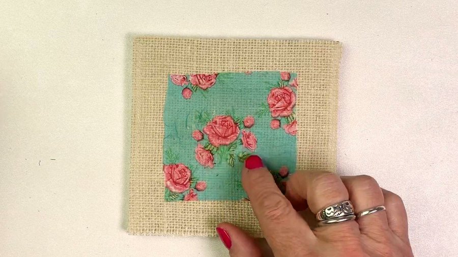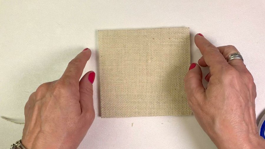 Voy a pegar sobre esta otra tapa una tela rústica como por ejemplo esta es una arpillera o tela de yute.