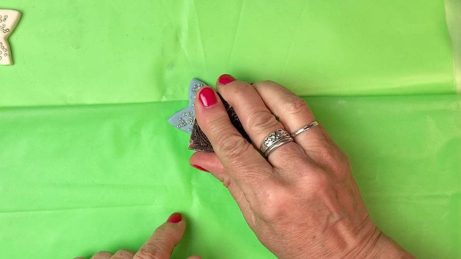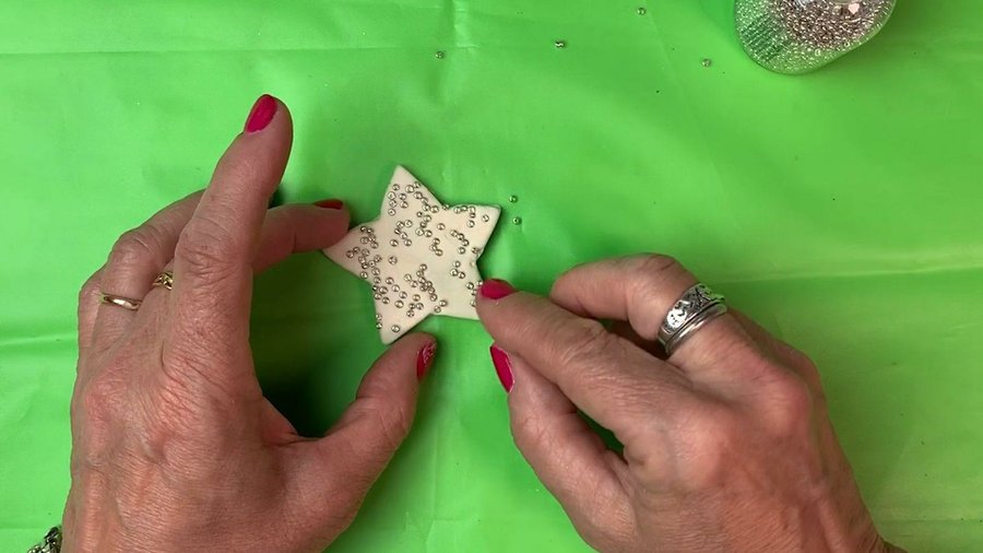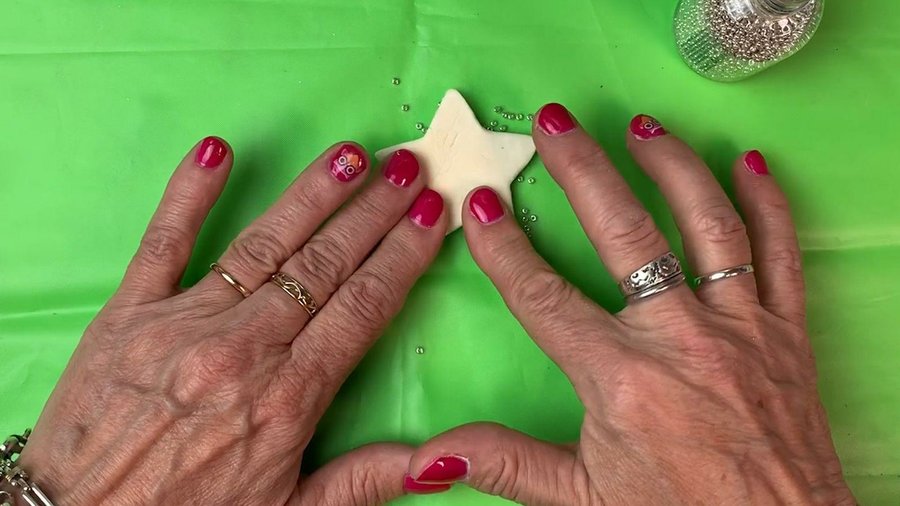 Antes de que se sequen coloco unas mostacillas plateadas y presiono sobre ellas la estrella para que se adhieran. Este color plateado combina muy bien con los colores que elegí. Es aconsejable presionar luego con algo plano para que las mostacillas queden bien pegadas.