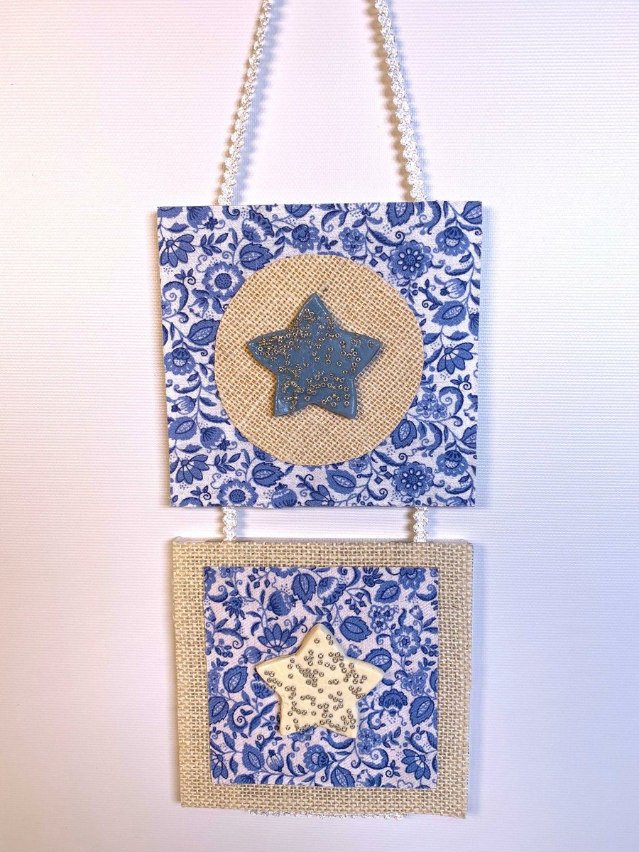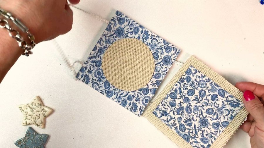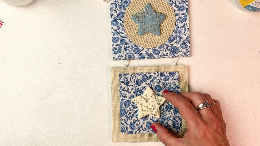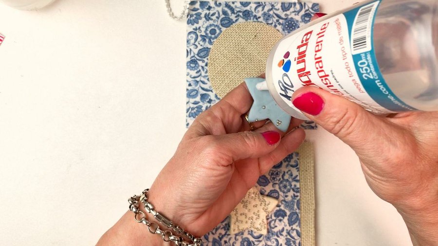 Para eso utilizo pegamento de silicona, la estrella celeste sobre el yute y la blanca sobre la tela estampada.