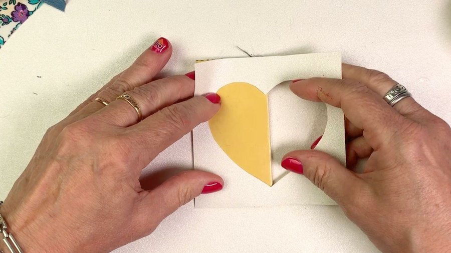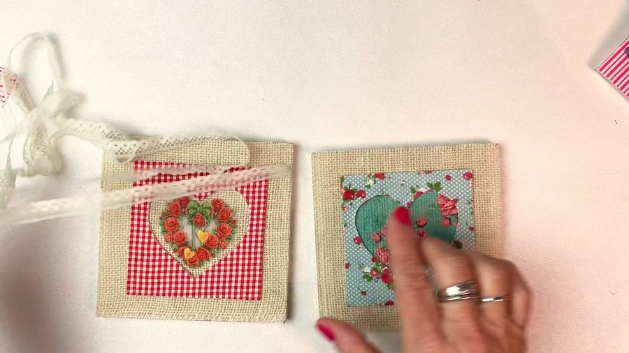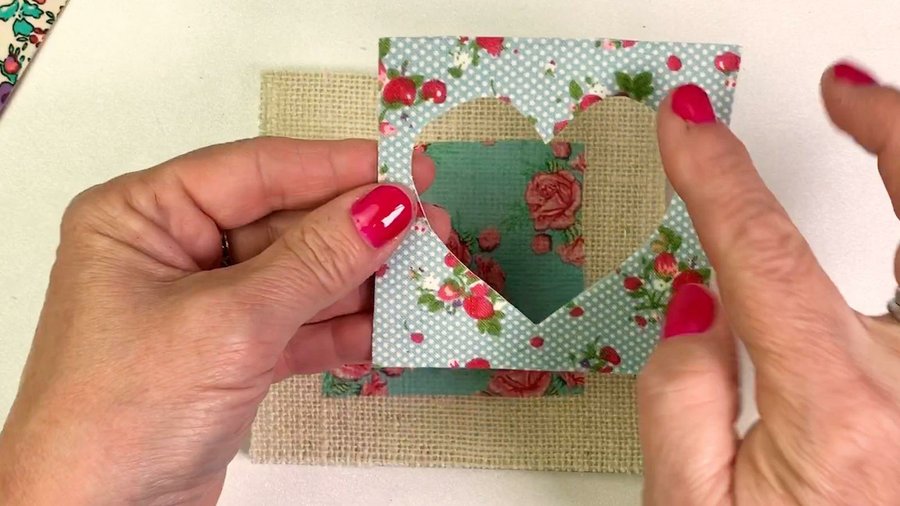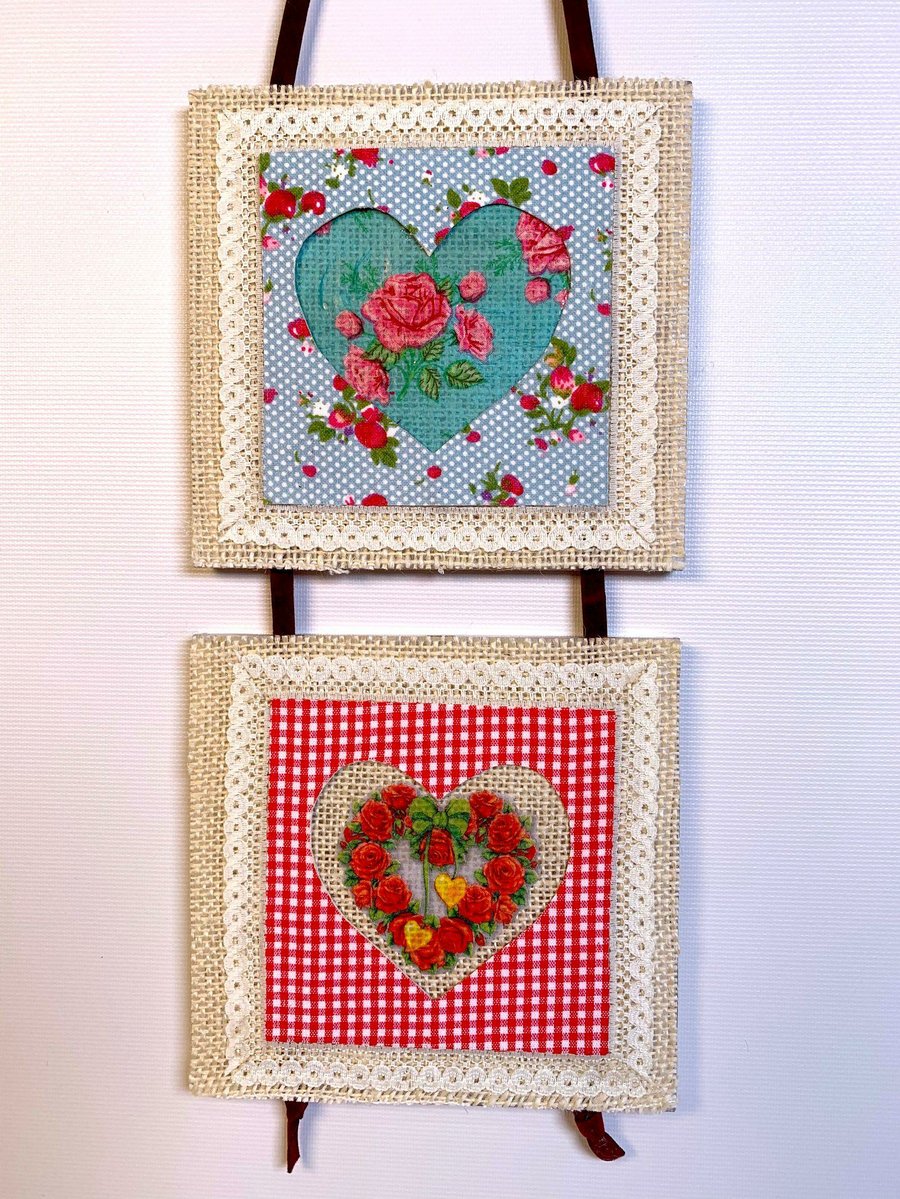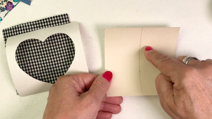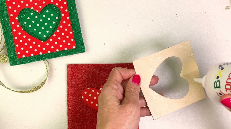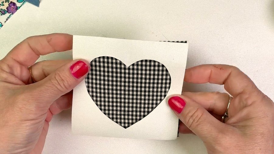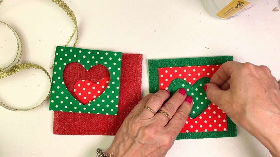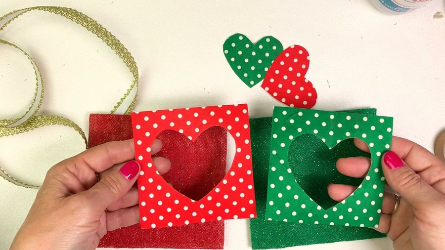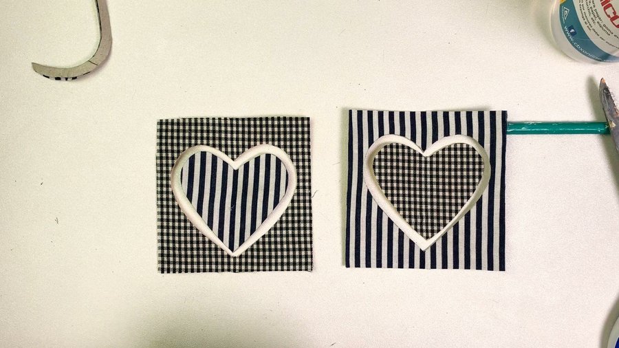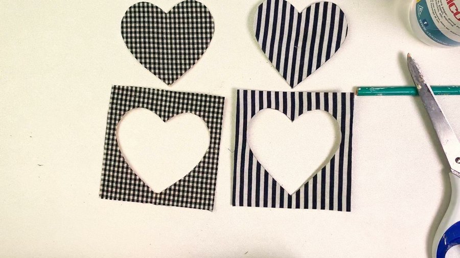 Aparte había pegado 2 telas con lunares en los cuadrados de cartón y les realicé el calado del corazón.