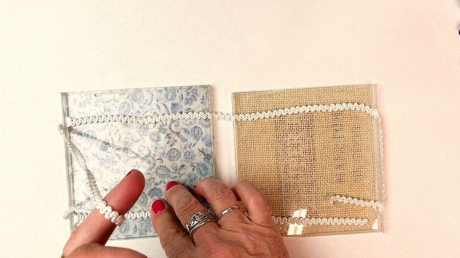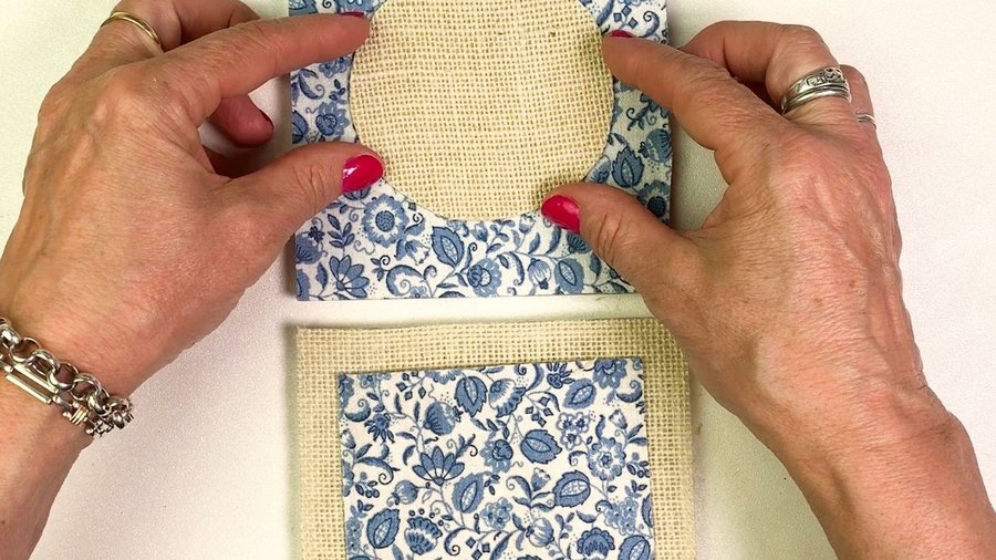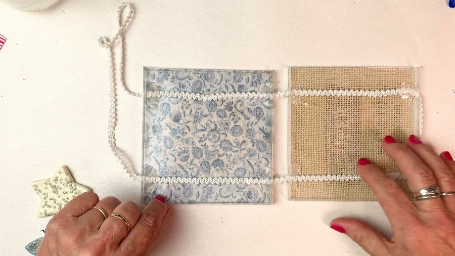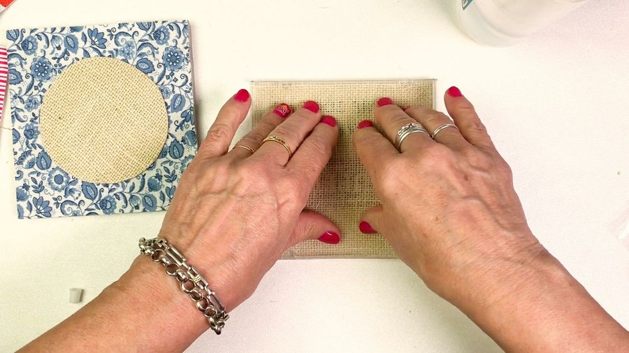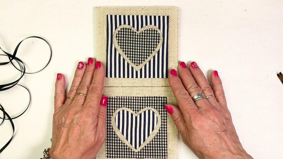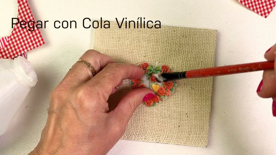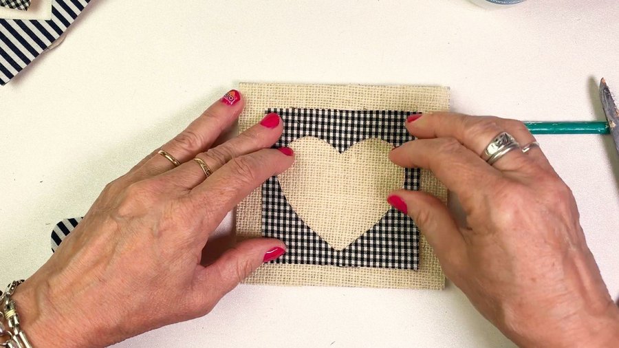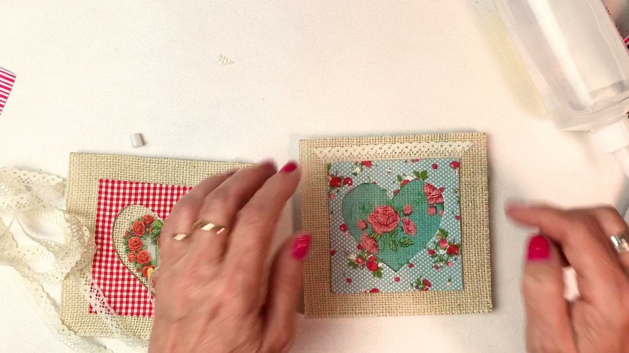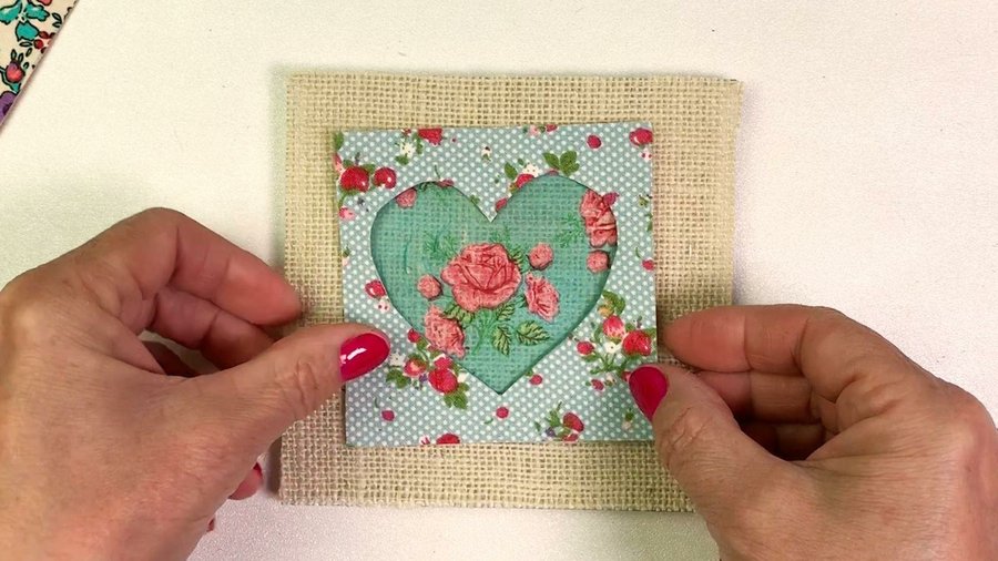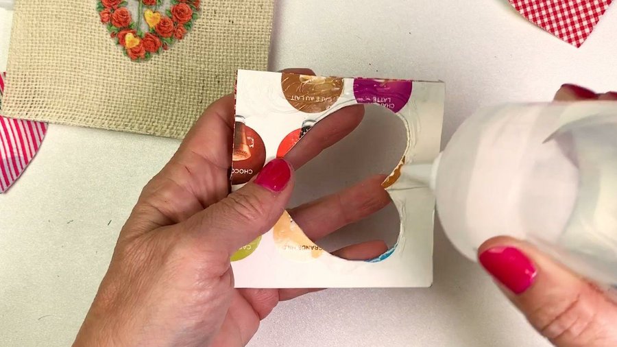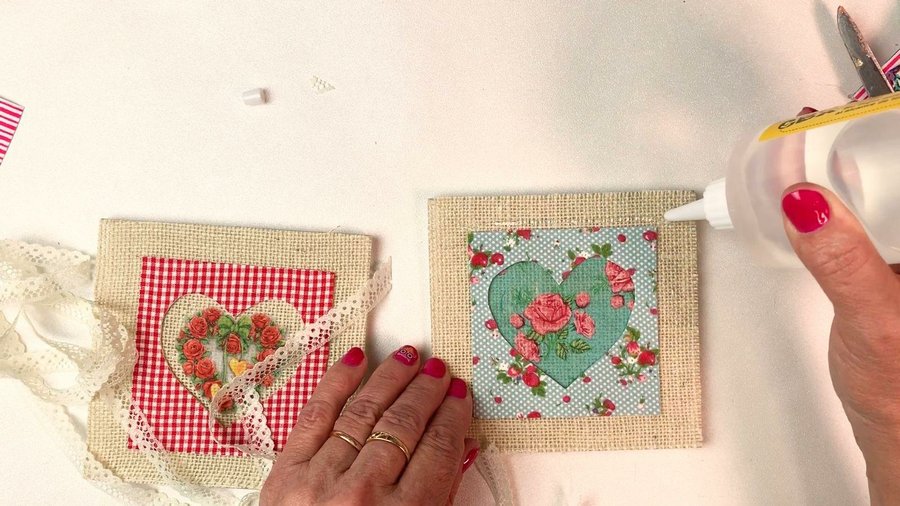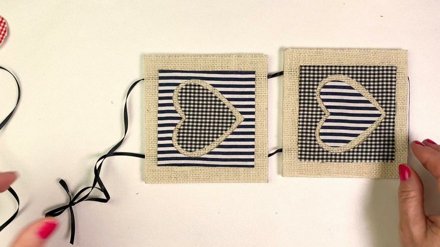 Ya tengo las 2 tapas con la tela de yute pegada y con pegamento de silicona en los bordes pego primero el cuadrado y también con el mismo pegamento el corazón del centro.