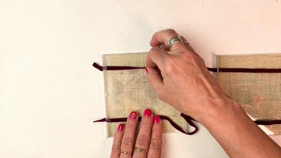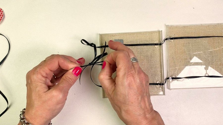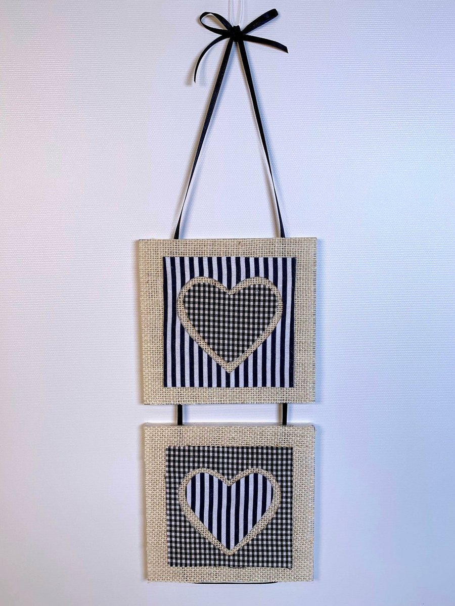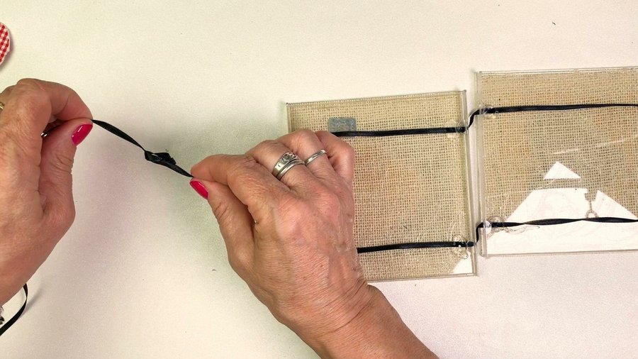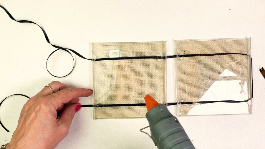 Aquí están los 2 cuadritos terminados, elijo cual irá en la parte superior y luego paso una cinta negra por los orificios. Elegí este color para mantener los contrastes que me gustaron como han quedado.
