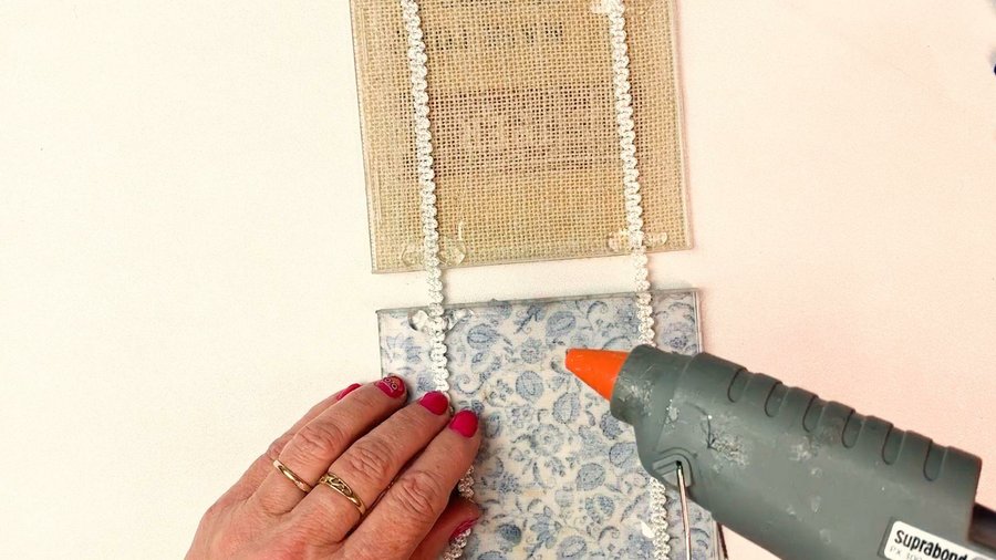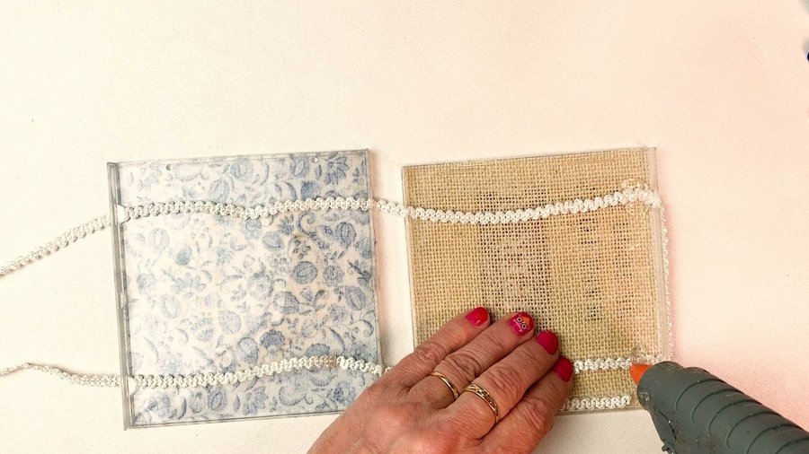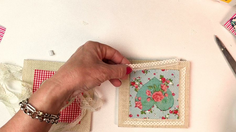 Para terminar voy a colocarle alrededor del cuadrado una puntilla, recorto los extremos en ángulo y se los voy pegando con el pegamento de silicona.