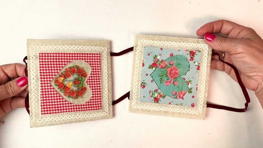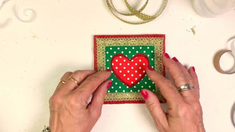 Para la otra tapa ya le había pegado otro trozo de servilleta y voy a colocarlo pegándolo por encima este cuadrado con el corazón realizado con otra tela. Este tipo de trabajos es ideas para utilizar los retacos que tenemos guardados.