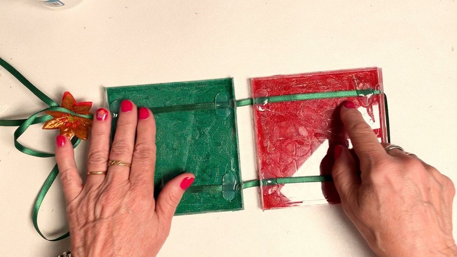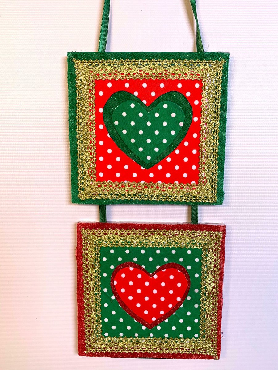 Para colgarlo usé una cinta de razo verde oscura, había pensado en una cinta dorada pero le quitaba protagonismo a los cuadritos y ésta permite que se luzcan muy bien.
