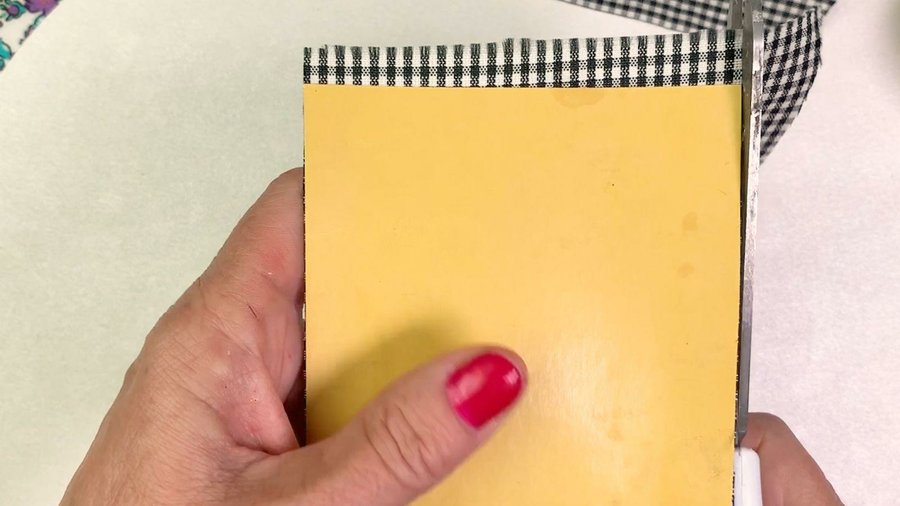 Sobre éste cartón voy a pegar la tela también con cola vinílica igual que la tapa, una vez que la tela esta seca la recorto prolijamente por el borde.