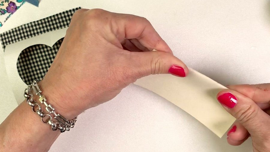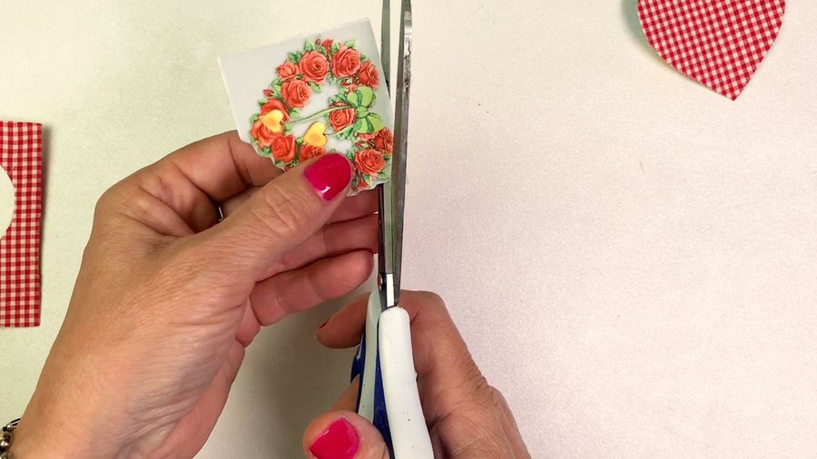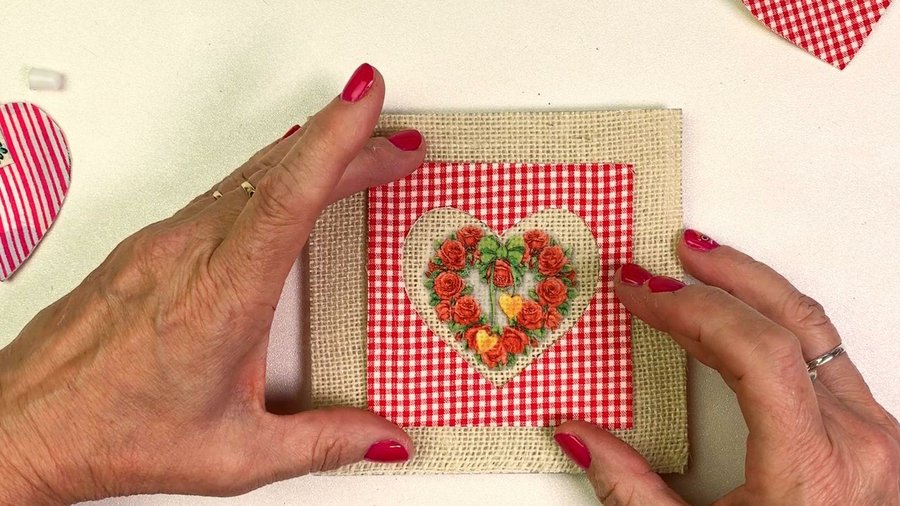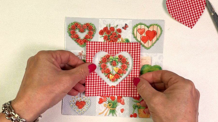 Preparo otro cuadrado con tela cuadrilla roja y blanca y recorto en él otro corazón y lo hago coincidir con el corazón que tengo de una servilleta.