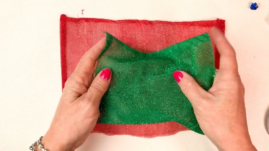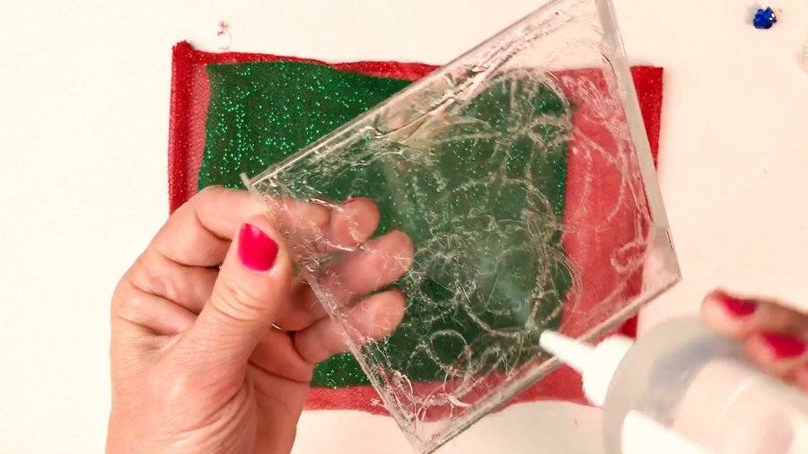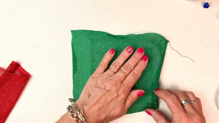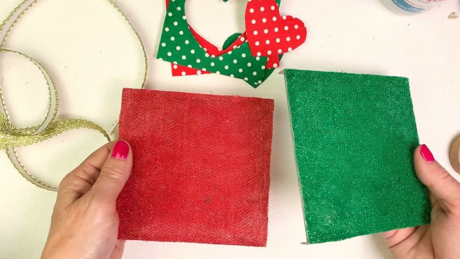 Para hacer éstos busque colores de navidad que tenía, en este caso estas telas brillantes que se suelen usar para hacer disfraces, lo único que son un poco transparentes, por lo tanto y por si a ustedes les pasa pegue primero una capa con pegamento de silicona , la recorté y cuando se secó primera le pegué una segunda capa y quedó mucho mejor.