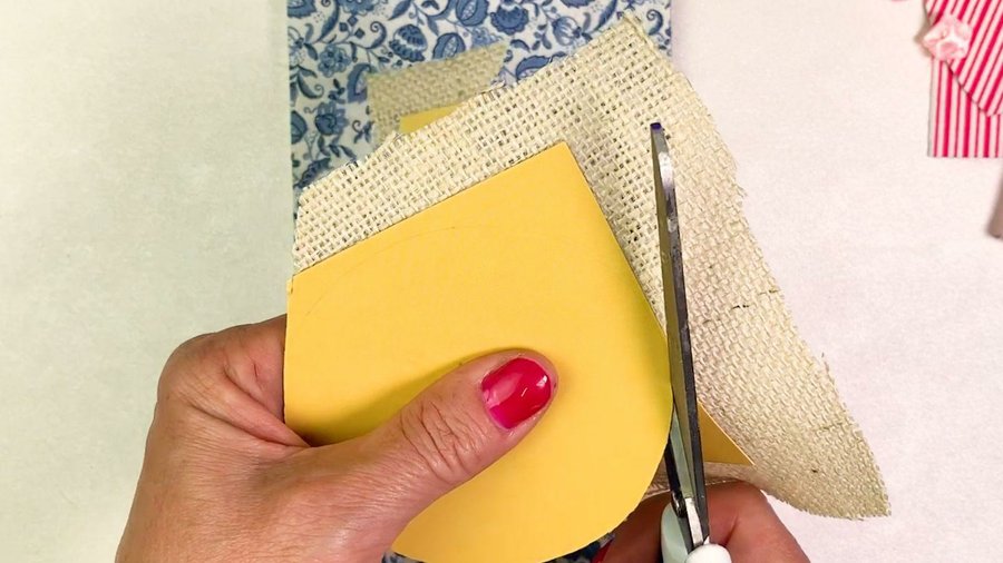 Corto otra pieza exactamente igual pero realizada sobre tela rayada y los voy a intercalar, pero los voy a achicar para que se vea el yute que está detrás. Doblo a la mitad nuevamente y recorto a gusto lo más parejo que pueda.