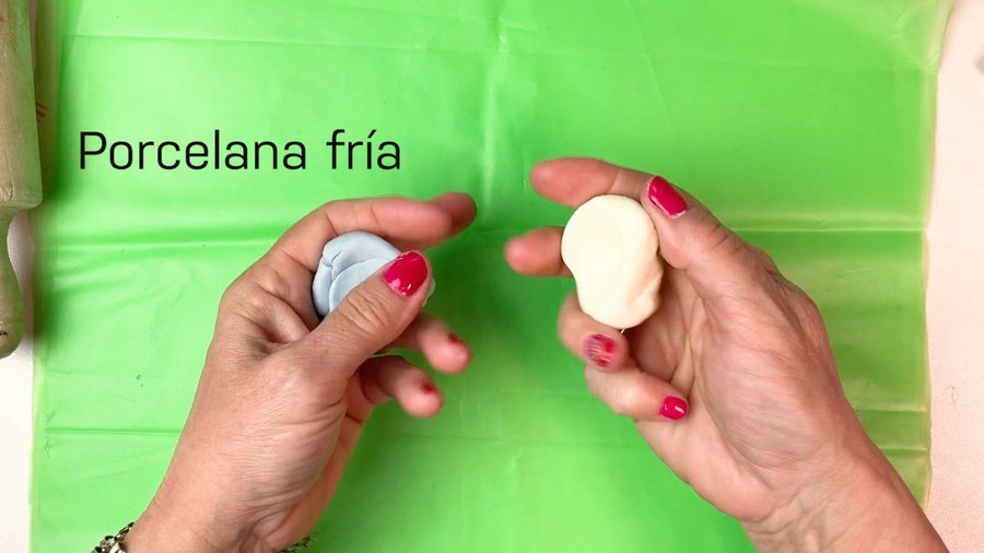 Para hacer los adornos preparé 2 porciones de porcelana fría a las que les di colores parecidos a los tonos de las telas de los cuadritos.