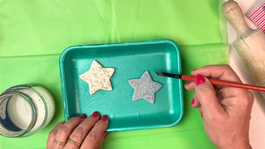 Dejo secar ambas estrellas y una vez secas las barnizo con barniz acrílico al agua brillante.