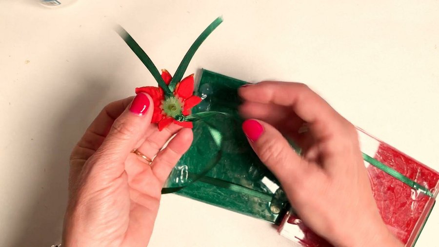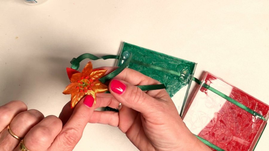 La manera de colocarla es igual que en los anteriores, nudo en la parte superior y le pegué una flor reciclada de un adorno.