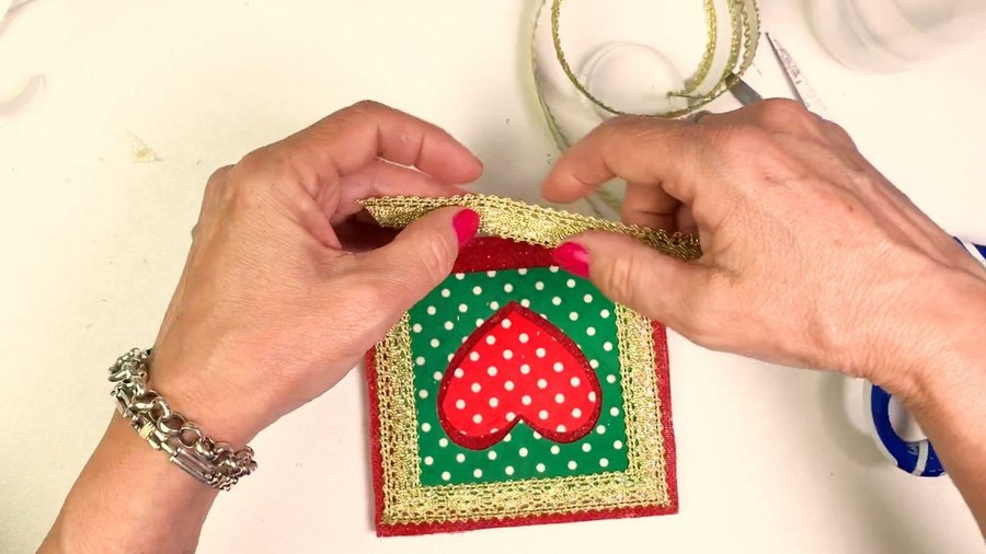 Como terminación le quería poner un toque dorado, tengo esta puntilla que es autoadhesiva, recorto de nuevo los extremos en ángulo y voy formando el marco alrededor del cuadrado.