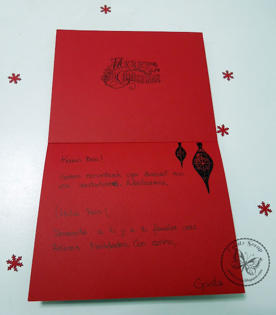 Y como la destinataria era Albasier, una chica de Donosti, pues la frase de felicitación tenía que ir en Euskera, si o si.☺ Perooooo el miedo se apoderó de mi y pensé "Escríbela también en castellano vaya a ser que no sepan Euskera" jeje! Así que dicho y hecho; una tarjeta bilingüe ;)