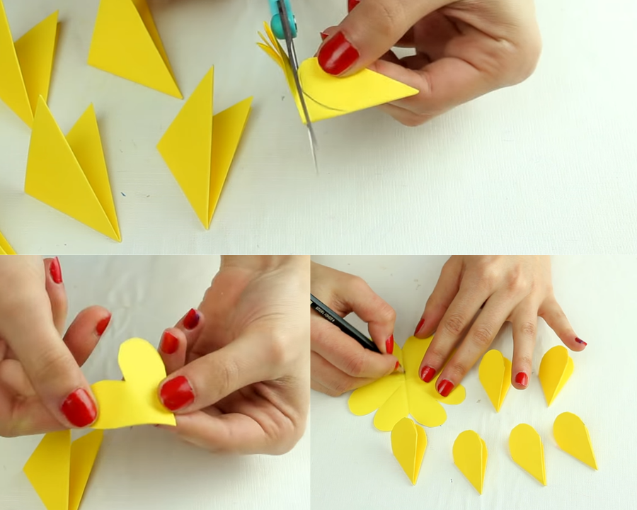 Después de esto, lo siguiente que debes hacer es recortar cada triángulo dándole forma de corazón. Cuando los abras tendrás pequeñas flores.