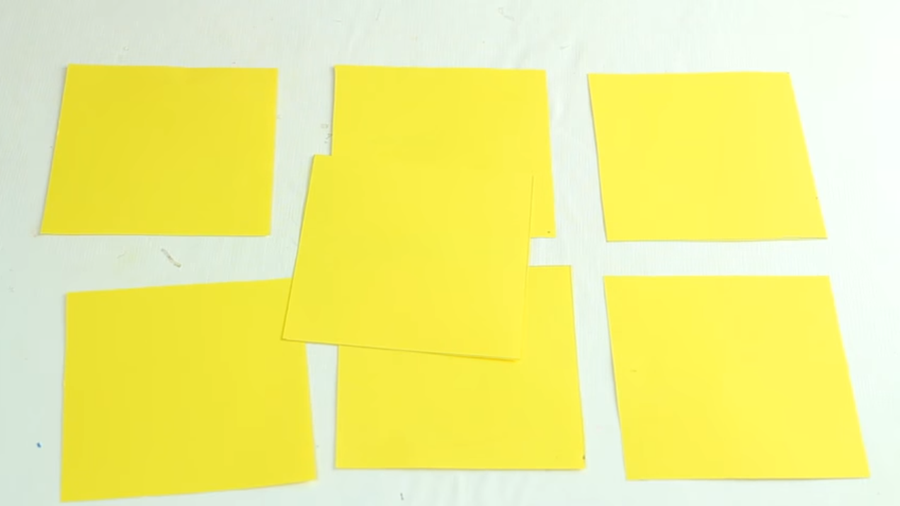 Para comenzar, recorta 7 cuadrados de la cartulina de uno de los colores, en esta caso amarilla.