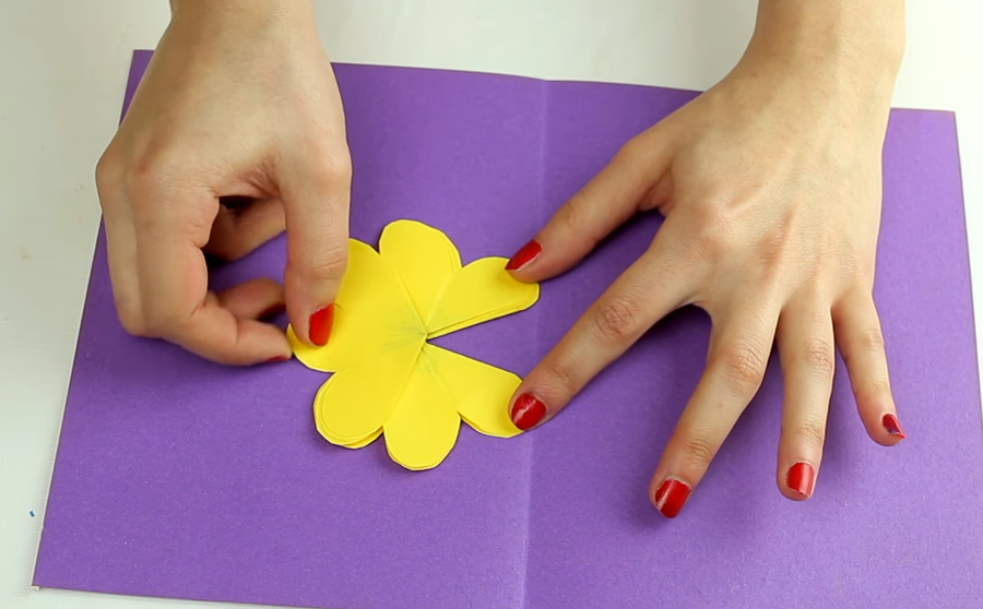 Para terminar pega cada lado de la flor conjunta que has conseguido en una postal de cartulina, de manera que cuando la abras, también se abra la flor. Así: