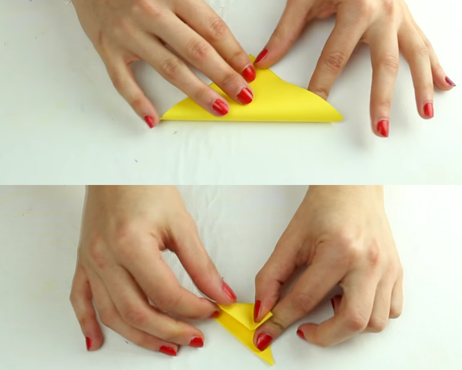 Ahora cada cuadrado debes doblarlo 3 veces, hasta tener un pequeño triángulo.