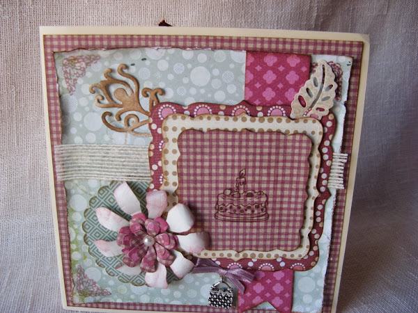 La base de la tarjeta es una cartulina color crema, que he recortado con la Silhouette SD para conseguir ese borde inferior y los papeles que he usado son del pad Hopscotch (Basic Grey). Toda la tarjeta está rodeada de falsas puntadas de boli de gel blanco y entintada con Distress Ink Antique Linen. Y en la parte central, en la tira rectangular, he utilizado el punch Scallop Sentiment (Fiskars).