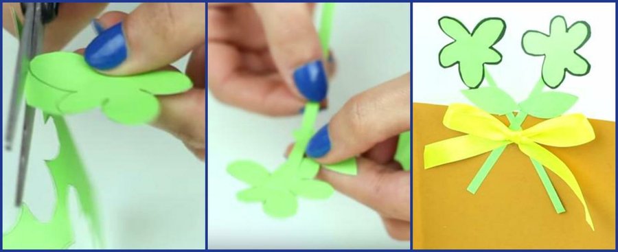 Con otra cartulina dibuja flores y hojas, y recórtalas para formar combinaciones. También corta una tira fina para hacer un tallo al que unir las formas anteriores. Puedes usar un color solo o varios para tener más variedad. Repasa los contornos con un rotulador y pégalos a la tarjeta colocando un lazo encima para tapar la parte del pegamento.