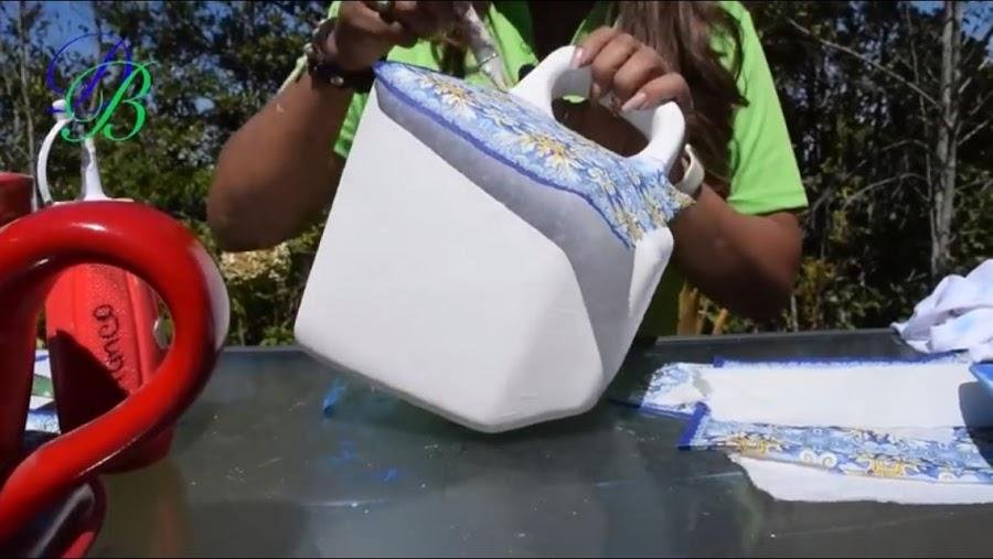 Ahora trabajaremos con la taza, pegaremos la servilleta por toda la taza tal como vemos en la imagen