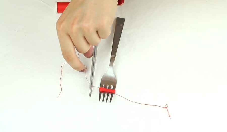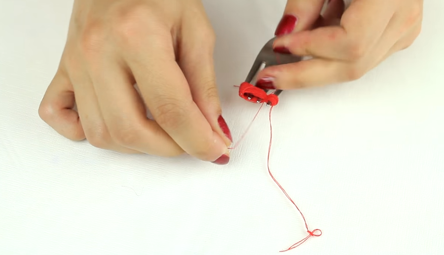-El primer paso de todos es coger el tenedor y alrededor de sus púas enrollar el hilo.