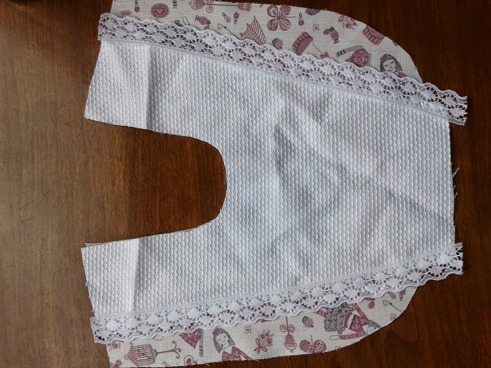 La parte de delante tiene un aplique sobrepuesto de piqué blanco y puntilla a ambos lados cosida a zig-zag estrecho uniendo el sobrepuesto con el cuerpo.