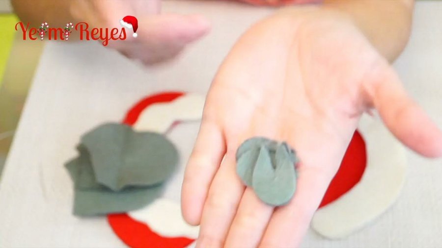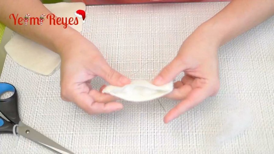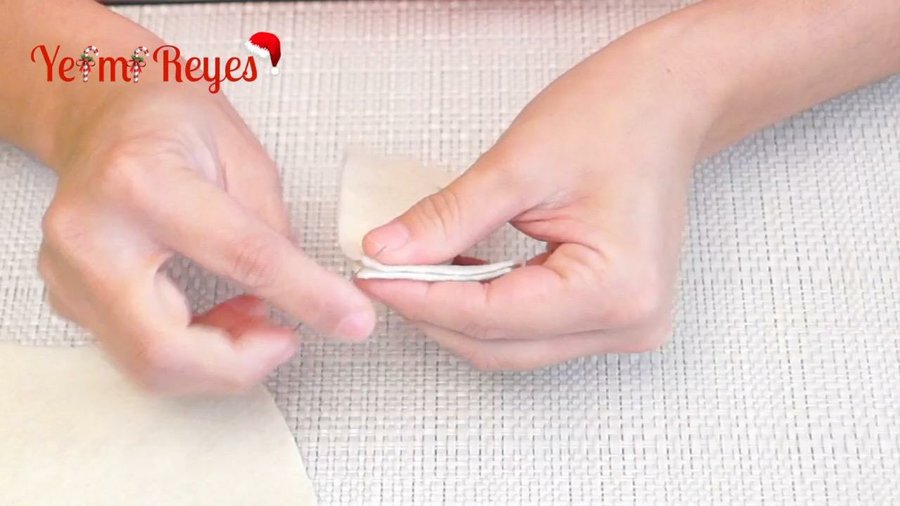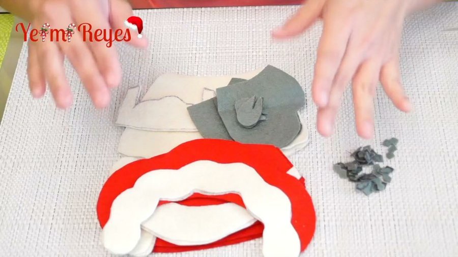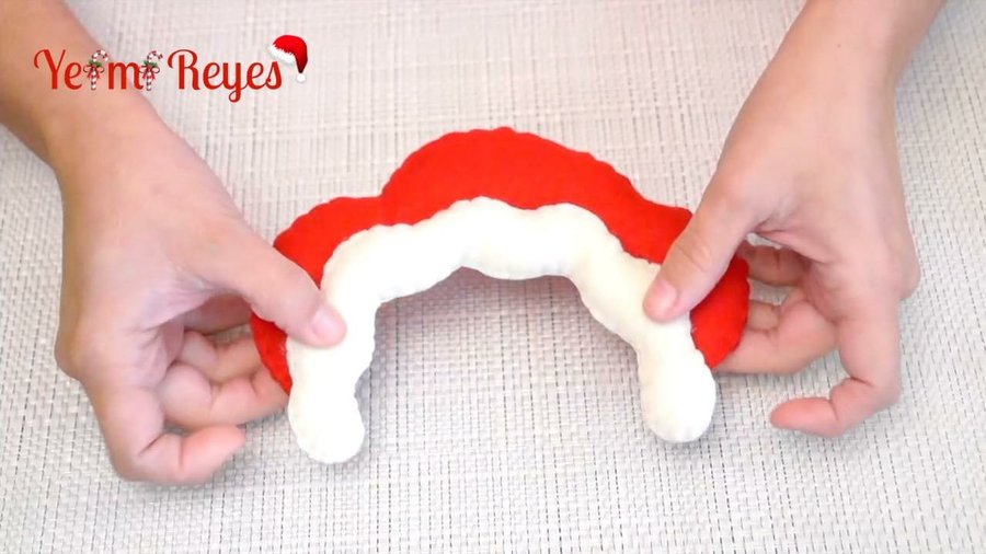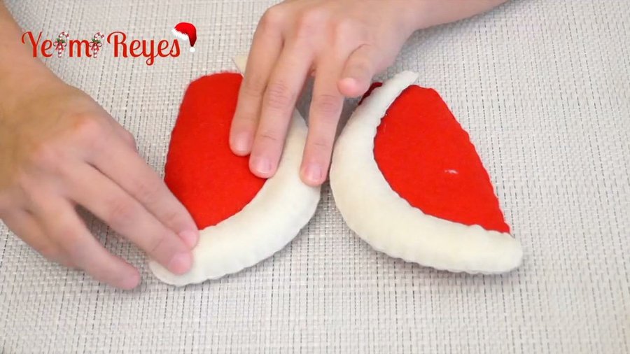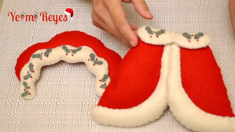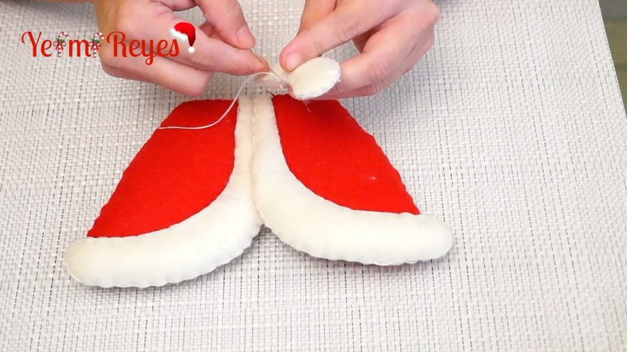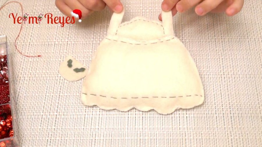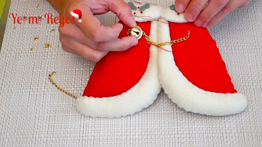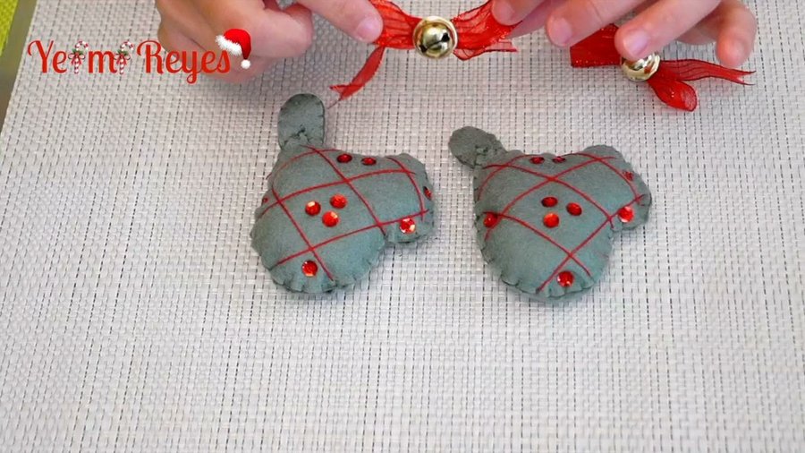 Los guantes los decoraremos con lineas diagonales hechas con hilo, lentejuela y mostacilla o chaquira roja, recuerdan el listón rojo realizaremos 2 moños con este y en medio le pegaremos un cascabel, ya listo lo pegamos a los guantes