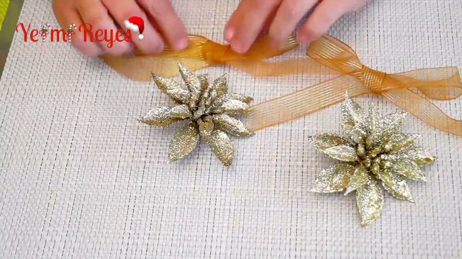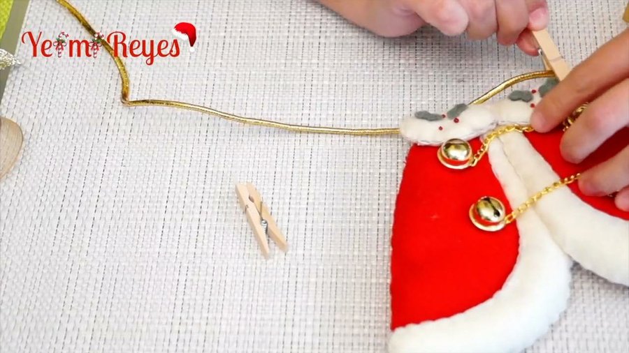 Con el liston dorado realizaremos 2 moños y en medio coloramos un pick navideño o una flor de navidad, estos moños los pegaremos en cada extremo del cordón dorado y por ultimo colocamos las piezas con las pinzas y listo tensemos nuestro tendedero.