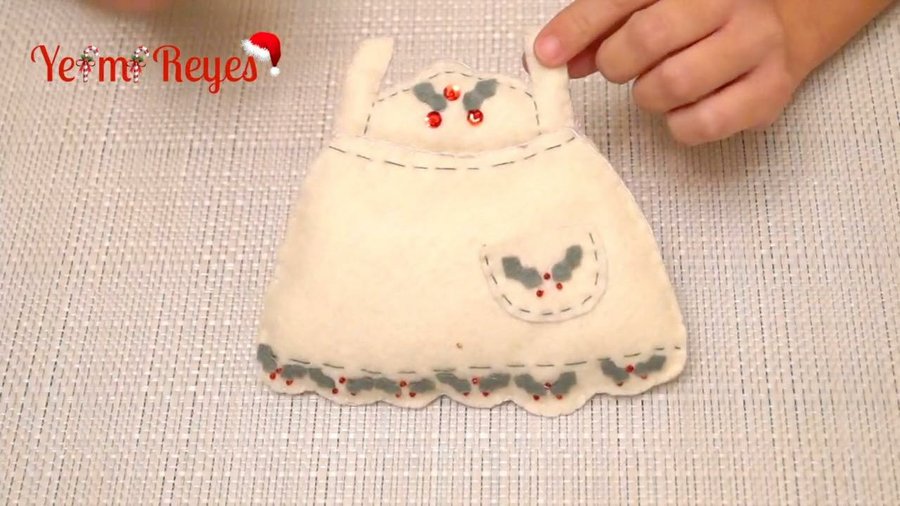 Decoraremos el saco, el vestido y el goro con un trio de mostacillas y pequeñas hojas en color verde musgo estas ultimas las pegaremos con fieltro verde musgo.
