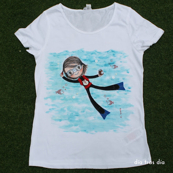 Hace ya algunas entradas os presentaba por aquí la nueva versión de Ro-ro: Ro-ro buceadora. Aquí os la enseñé y os conté cómo surgió hacerla.Esta camiseta que ya hice fue un regalo que hicieron a una chica llamada Marta. Pues a Marta le gustó tanto la camiseta que me encargó una similar para regalar a su amiga Rosa.La idea fue partir del mismo modelo que ella tenía, pero intentando personalizarla ...