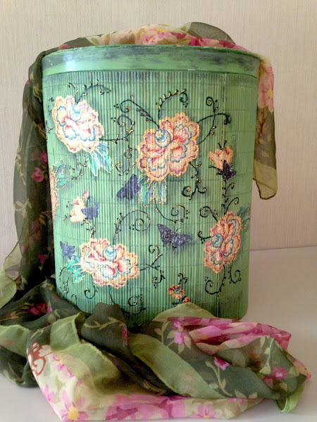 Caja de fibrofácil, forrada con papeles, y decorada con decoupage.