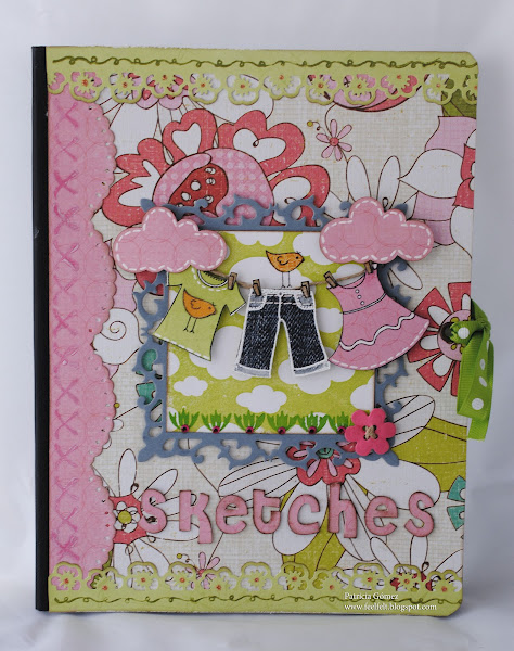 La base, un cubo de madera forrado con papeles de Restoration (Crate Paper), con una tira de cartulina troquelada con Scallop Dot (Martha Stewart) y rodeado por una lazada de hilo blanco. En el frontal tiene un círculo con la letra de su destinataria, una M, que es un sticker de Pink Paislee.