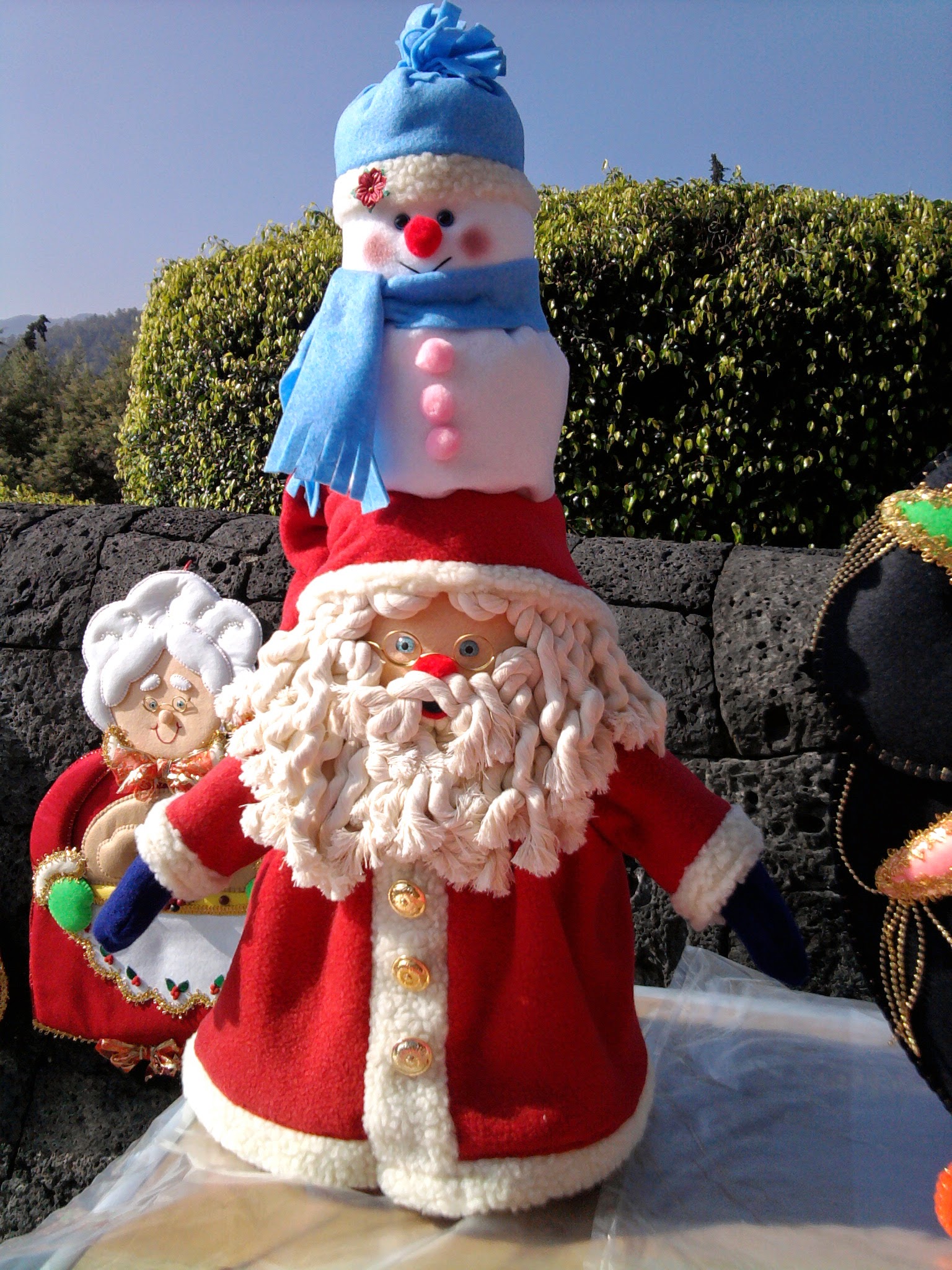 Elabora un saco, este será la base de la torre, introduce una base de madera con poste (la puedes adquirir en Fantasías Miguel), coloca una bolsita con piedritas o canicas, relleno y cierra el saco, debe quedar a una tercera parte del poste, la cara es un círculo con relleno, coloca el gorro de santa y fija con silicón; el muñeco de nieve son dos rectángulos, debes fijarlos también con silicón y al final el gorrito.