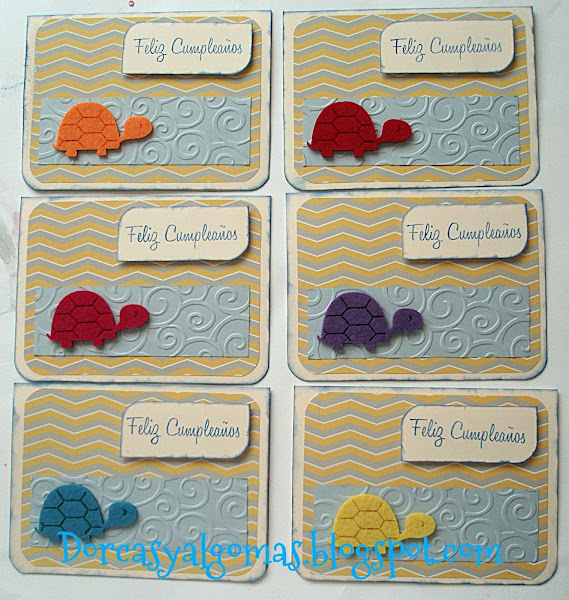 "Muy buenos días a toda la gente maravillosa del ciberespacio:Os muestro unas tarjetas de felicitación para niños, cuyo motivo principal son unas tortuguitas de fieltro que encontré en un bazar.Espero que os haya gustado.Recordad que no hay ninguna cosa seria que no pueda decirse con una sonrisa.¡¡¡Una gran bendición para tod@s!!!