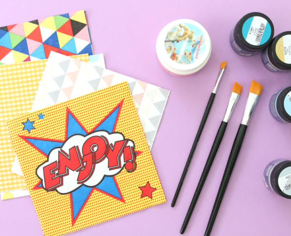 La caja contenía unas cuantas maravillas: un mod podge textil, servilletas de diferentes diseños y colores, tres pinceles y un montón de pinturas para tela. Un auténtico desafío para mí, porque no son materiales que suela utilizar. De hecho, jamás me había aventurado con el decoupage.