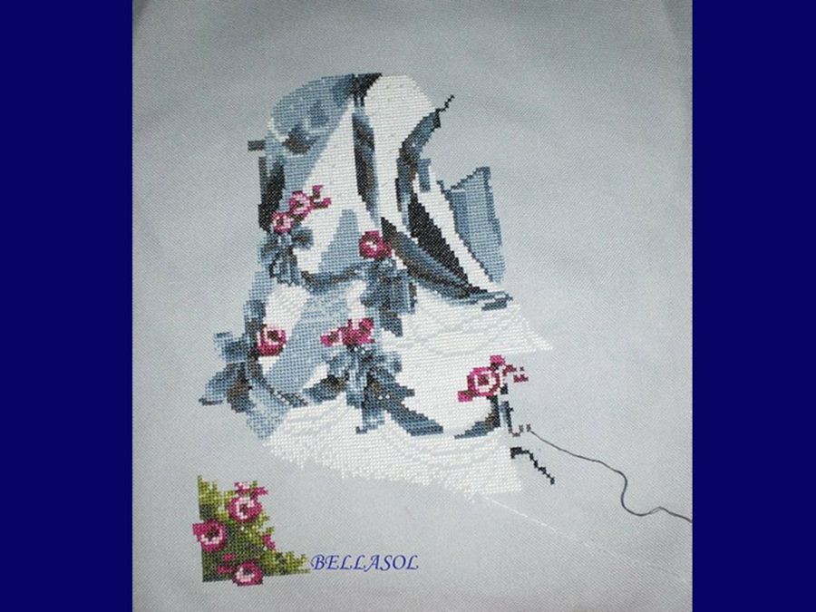Concluye la deliciosa pasarela con el bastidor de nuestra amiga Bellasol, responsable de tan sugestivo álbum de labores empezadas gracias a su post en el foro. ¿Adivinas lo que está bordando en esos tonos azules? ¿Un vestido de época? ¡Se admite que la autora deje alguna pista!