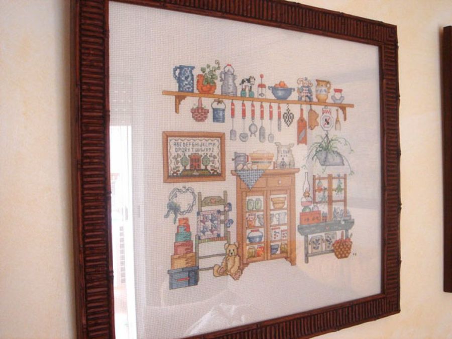Las cocinas se prestan a los adornos en punto de cruz, y más cuando el motivo es la suculenta repisa de Begomat, en un formato apaisado muy moderno.