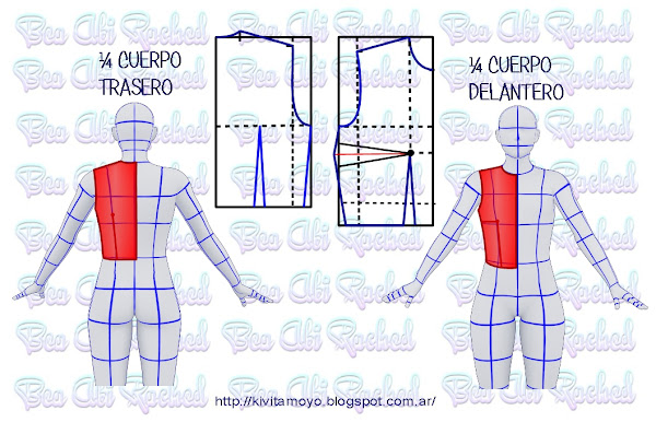 Para el cuerpo Medida entera Parte que se utiliza Ancho de espalda 40 cm 1/2 (20 cm) Contorno de pecho 100cm 1/4 (25cm) Contorno de cintura 66 cm 1/4 (16,5cm) Largo de talle delantero 45 cm Entera Largo de talle espalda 41 cm Entera Altura de costado 19 cm Entera Altura de hombros 36cm Entera Altura de pinza del pecho 27 cm Entera Largo de pinza del pecho 12 cm Entera Para la falda Contorno de cadera 100cm 1/4(25 cm) Altura de cadera 20cm Entera Largo de falda 56cm Entera