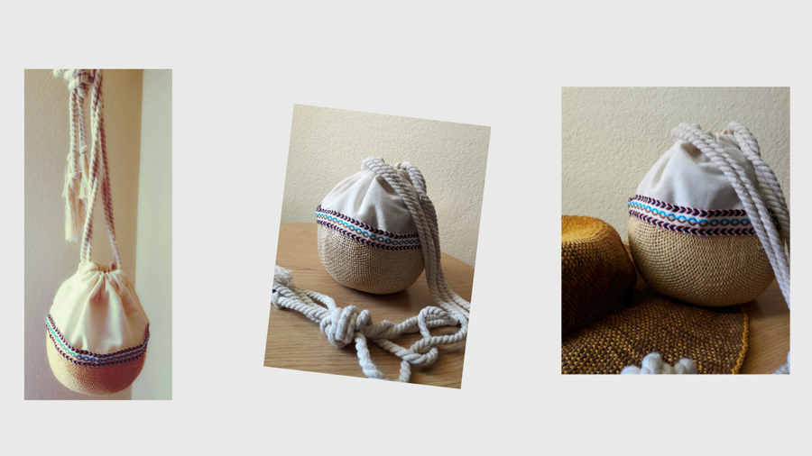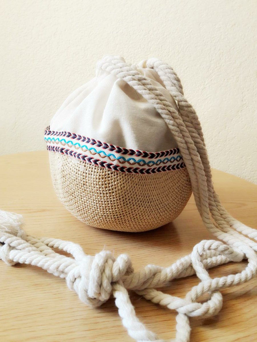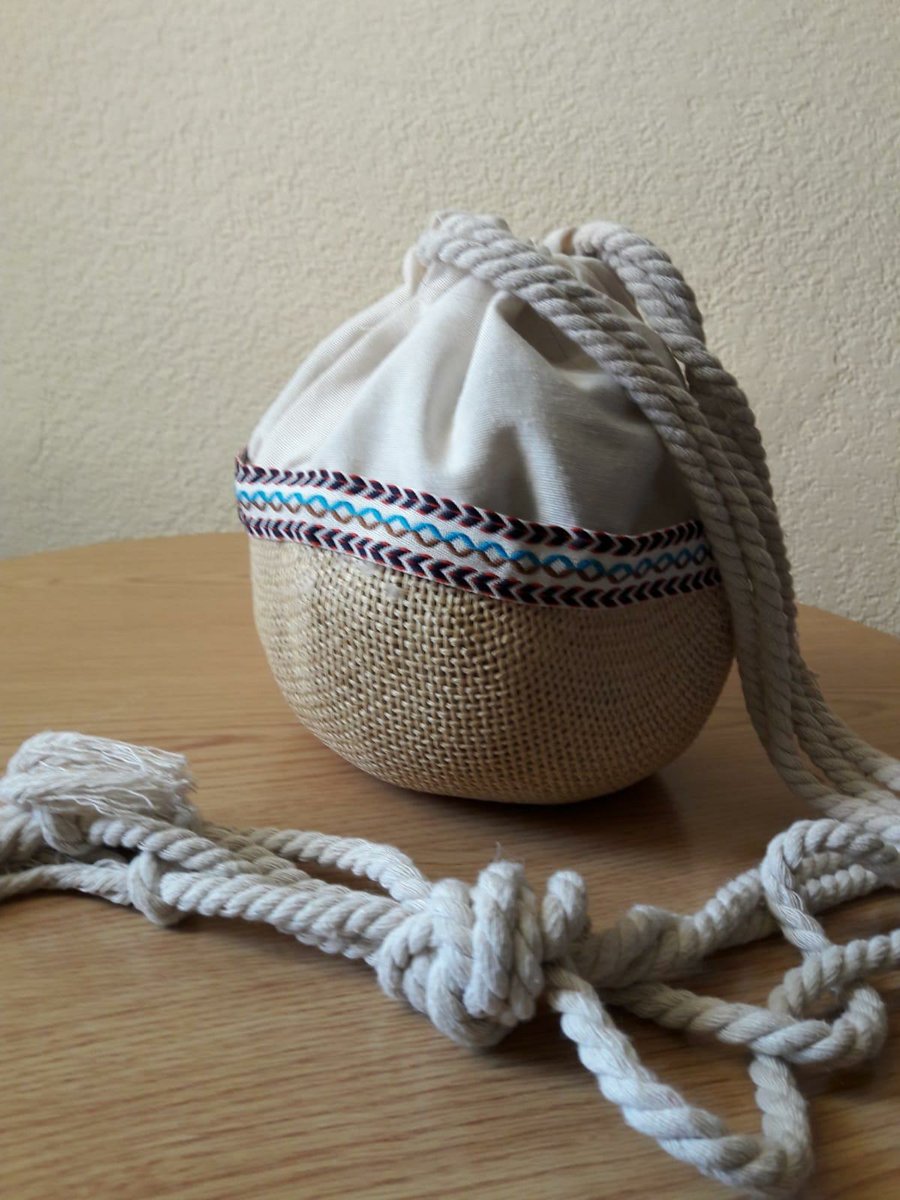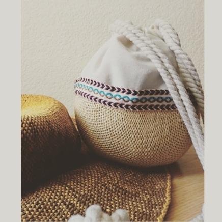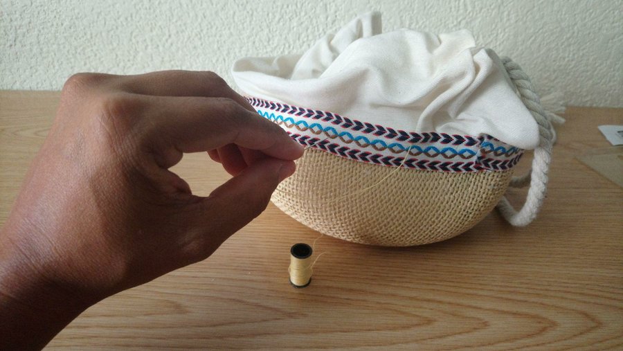 Luego para tapar la unión entre el sombrero y la tela, coseremos una cinta decorativa de nuestro agrado, pasaremos la aguja entre la tela y el sombrero para reforzar nuestro bolso.