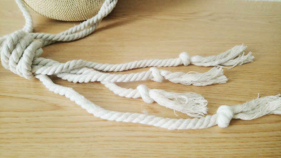 Cuando hayamos metido las cuerdas haremos un nudo en los extremos y dehilacharemos las puntas para dar ese aspecto boho chic.