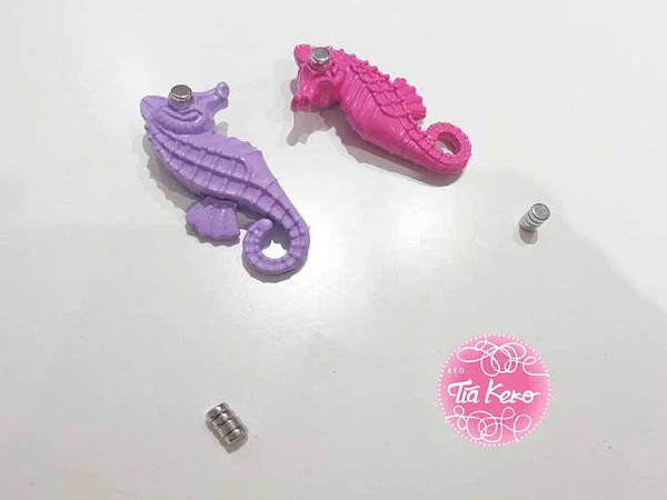 Para que el juego funcione debemos imantar los caballitos de mar, para ello, con la ayuda de la pistola de silicona vamos a pegar un imán pequeño en cada caballito.