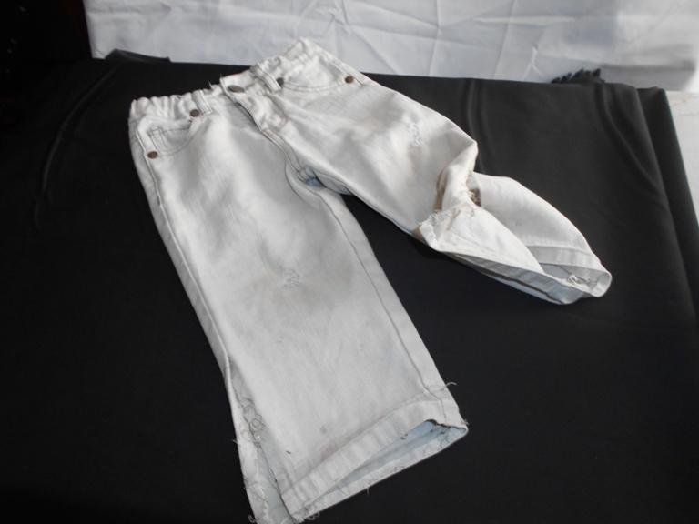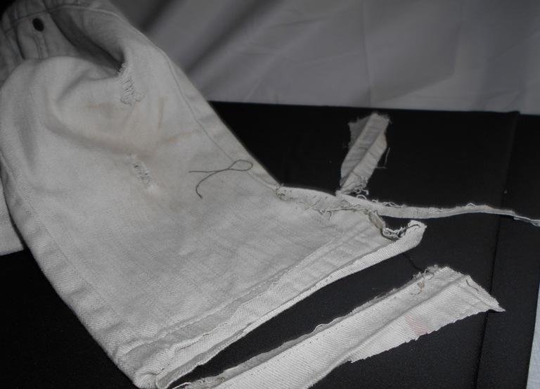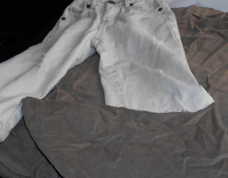 .La idea para este pantalón estilo jeans fue desmontar las costuras de los lados una buena parte, y perder parte de su dobladillo para no dejar huella de las costuras del mismo, difíciles de borrar, de tal manera que el aumento fue bastante. Una sola pieza en forma asimétrica nos dio como resultado una figura a los lados aceptable.
