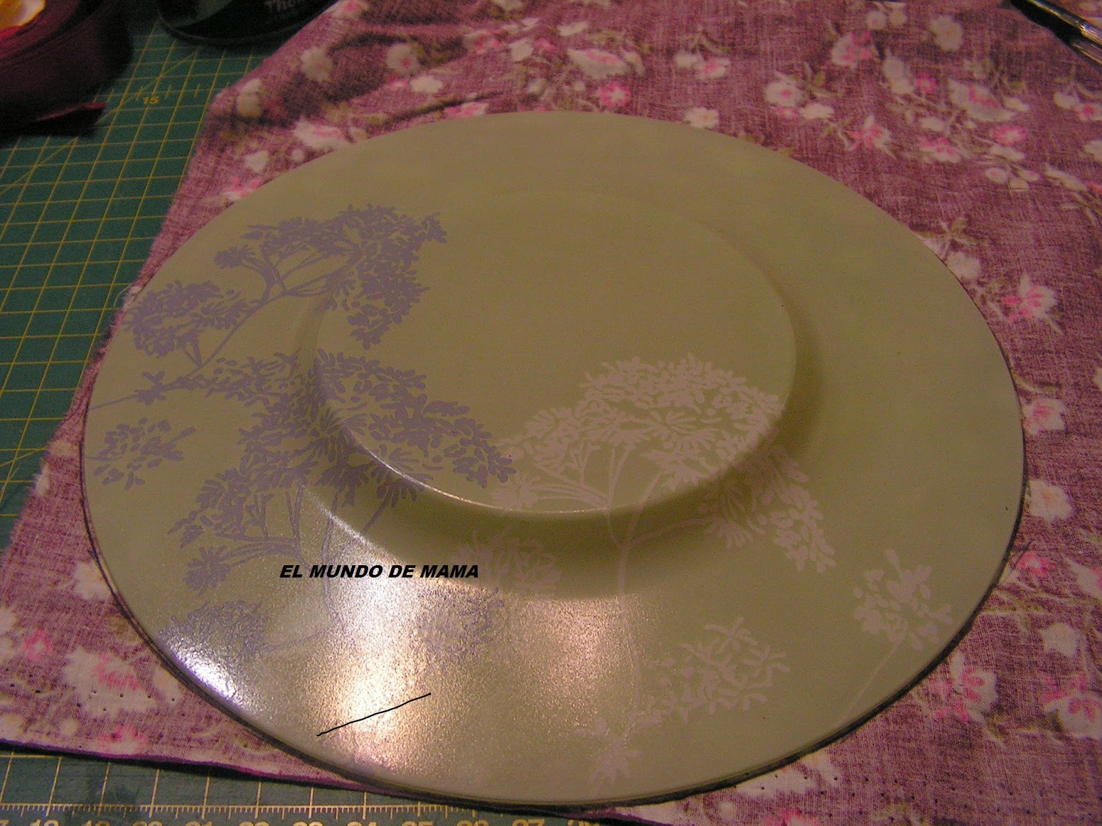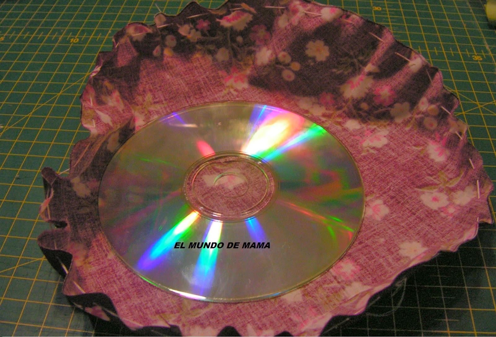 Asi que he buscado un plato mas grande( en mi caso es el de postre) que el cd, para cortar la tela ya que me tiene que cubrir todo el cd.