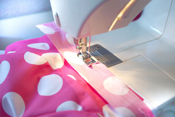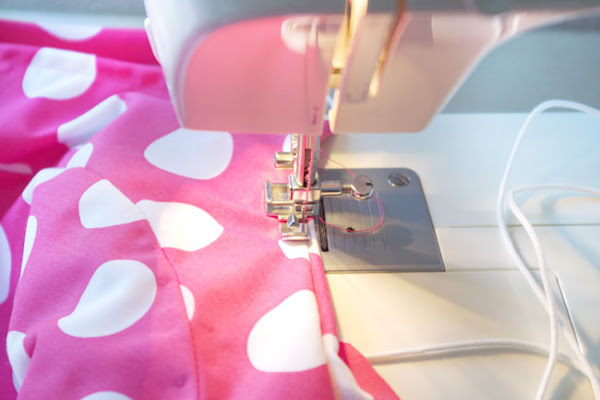 3) Una vez unida la cinta al bies al escote, vamos colocando el cordón y girando la cinta dejándolo completamente dentro. Si no tienes mucha destreza con la máquina aún, es mejor que lo hilvanes primero antes de coserlo en la máquina.