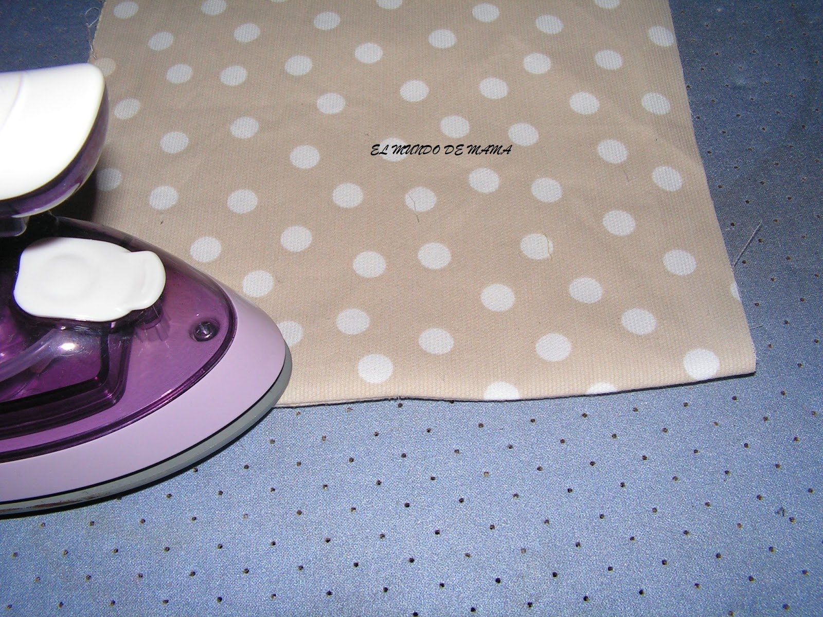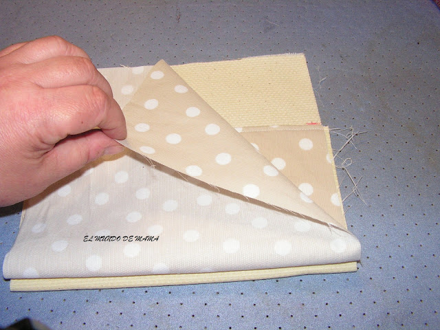 Cojemos el lado cosido y lo llebamos hasta las marcas que hemos hecho, como se ve en la foto.