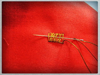 11. Volvemos a salir hacia el frente de la labor pinchando justo al lado de donde nos acabamos de meter, y repetimos la operación, pero OJO debemos coger las hebras alternativamente pero al contrario que en la hebra anterior. Si la primera era: por arriba, por abajo, por arriba; la nueva será por abajo, por arriba, por abajo.