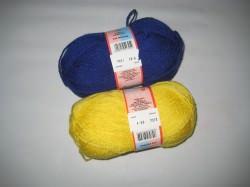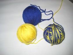 Antes de empezar a tejer he preparado tres ovillos con la lana doble: uno de color azul, otro en amarillo y el tercero mezclando los dos colores.