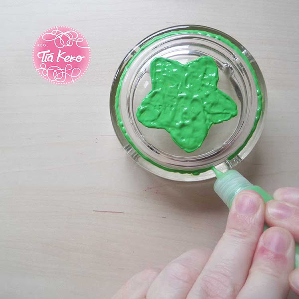 Cuando ya tenemos el cenicero limpio y seco, decidimos con que dibujo vamos a decorarlo. Las niñas pensaron que una estrella quedaría muy bonita, así que eso hicimos. Cogimos la plantilla y pintamos la estrella con la pintura especial para cristal.